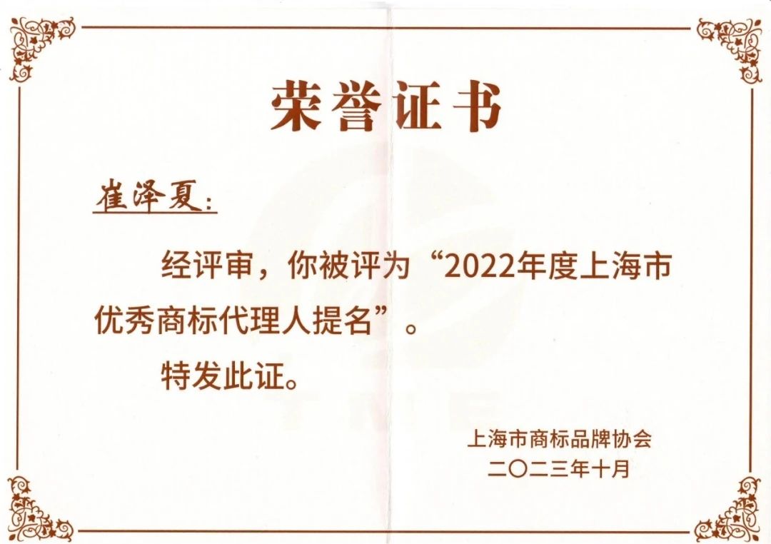 集佳上海分所崔泽夏律师获得2022年度“上海市优秀商标代理人提名”