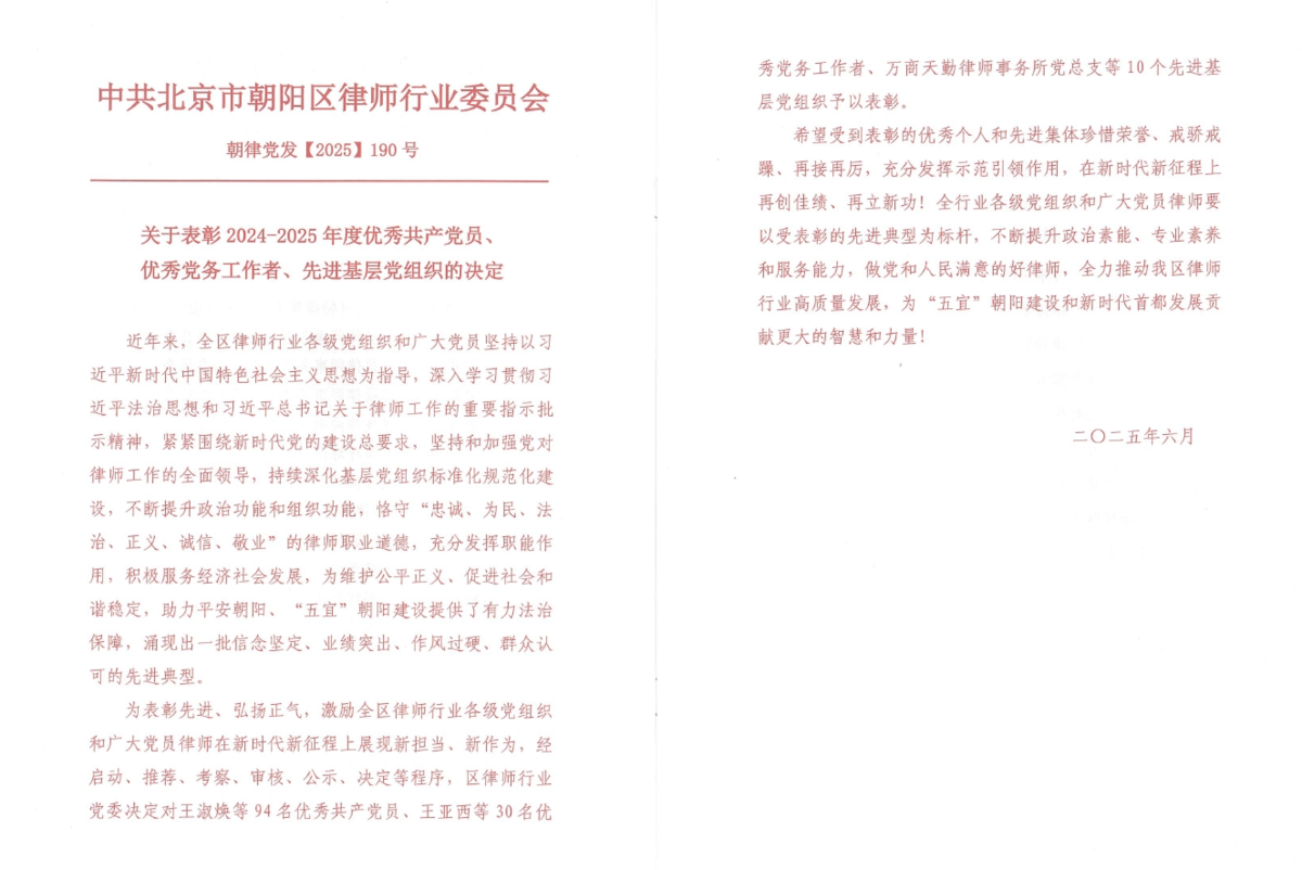 6月27日,朝阳区律师行业党委召开了朝阳区律师行业庆祝中国共产党成立104周年暨总结表彰大会,开云联合党支部党员黄莺荣获“朝阳区律师行业优秀共产党员”称号,支部党员汪琨荣获“朝阳区律师行业优秀党务工作者”称号。